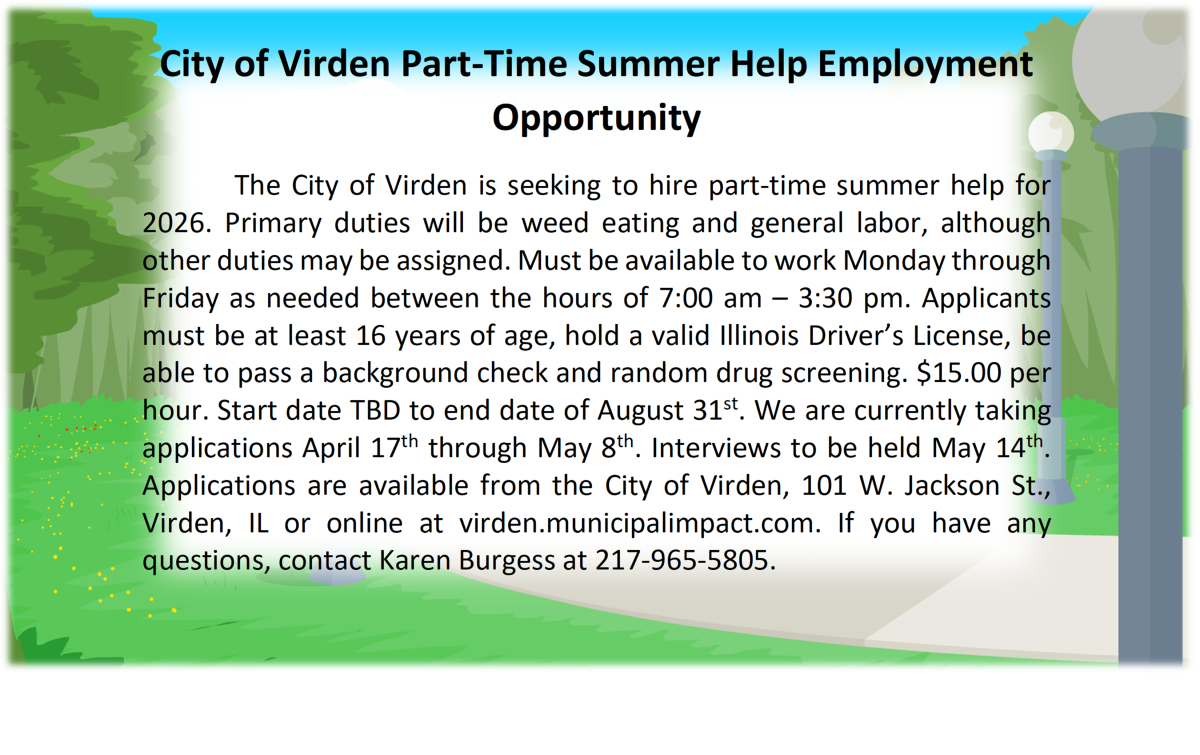 The City of Virden staff strive to keep you updated on all matters related to your community. If you do not find the information you need, please contact our office and we will gladly assist you! Subscribe today and receive up to the minute News and important Alerts delivered straight to your inbox.
